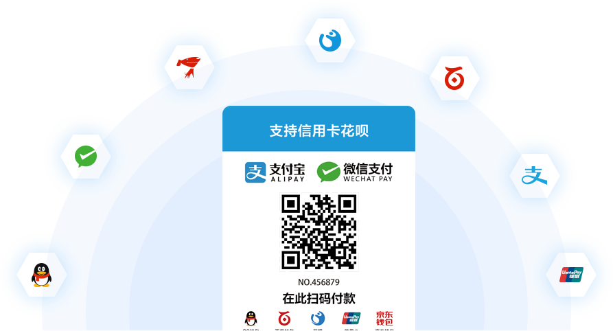 支持支付宝、微信、QQ钱包、京东钱包、百度钱包、花呗、信用卡等多种支付方式